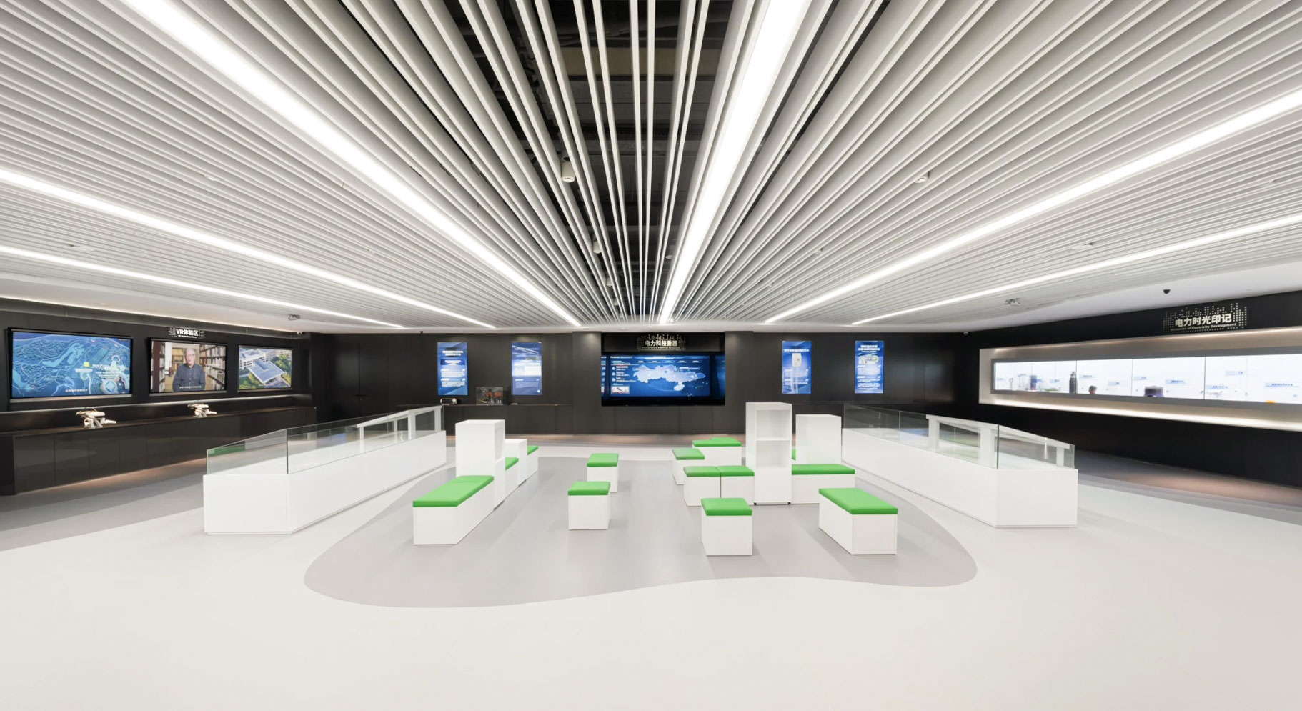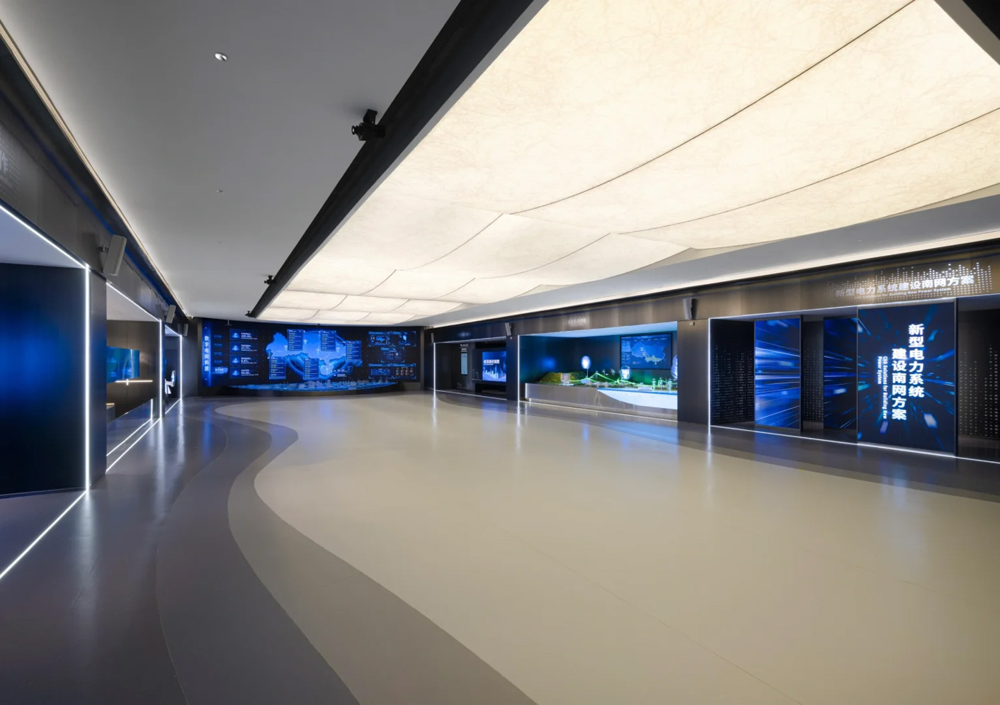 建筑首层层高5.2 m,二层3.65 m。原一层为展示大厅,二层为办公室及休息室。马博(中国)装饰对一、二层进行全面的装修、暖通、给排水及强弱电系统升级改造,实现的功能为新型电力系统展厅,集中呈现海南电网在新型电力系统领域的最新技术成果。