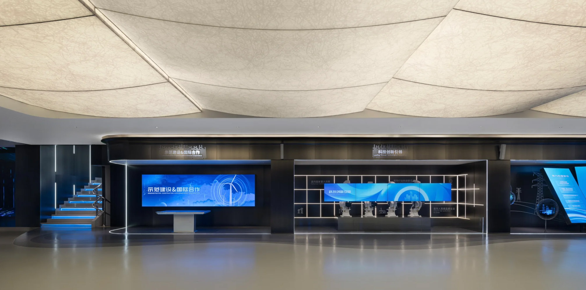 作为迎接博鳌亚洲论坛及其他国际性行业论坛重要嘉宾的窗口,项目肩负着展现中国能源央企形象的重任。马博(中国)建筑装饰以“大开大合”的空间布局,打造国宾级接待空间,实现从序厅到主展区之间的自然过渡。通过巨大的环形幕,构建沉浸式企业“界面”,进一步强化主入口的视觉焦点。